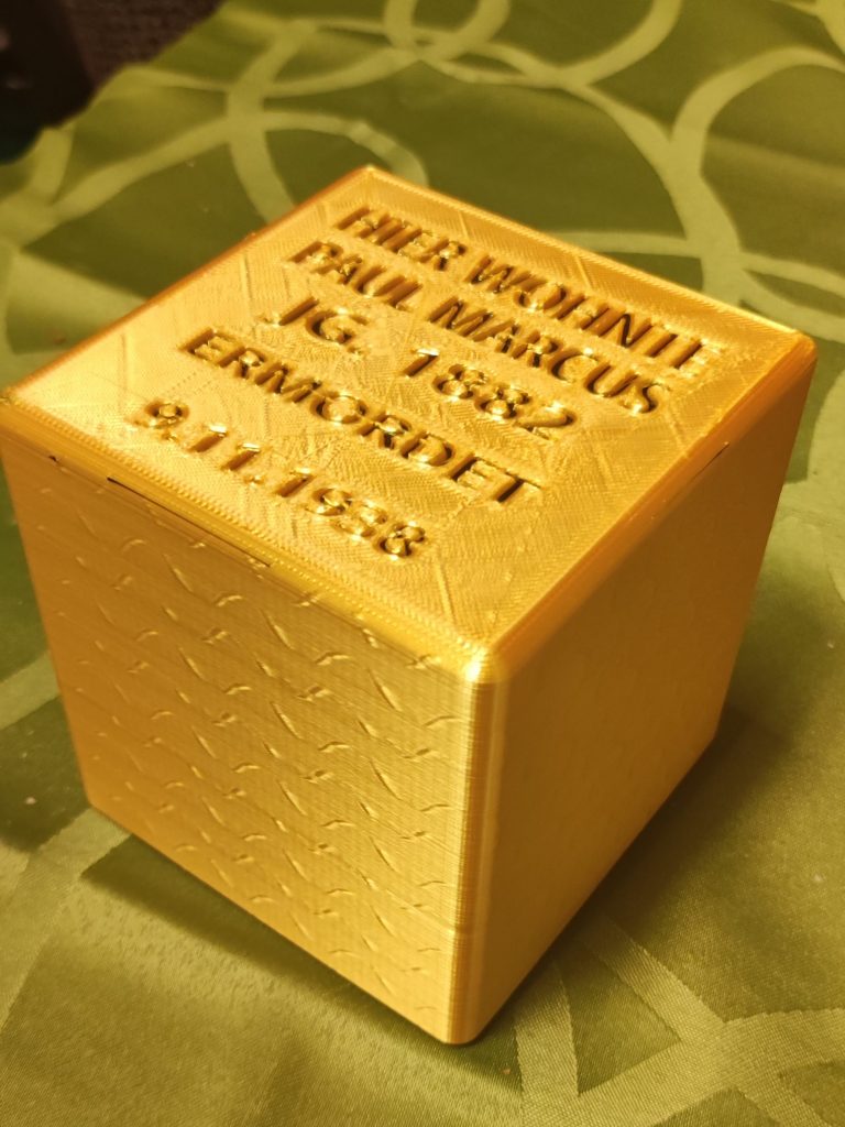 Das Projekt war die 1:1 Kopie eines Jenaer Stolpersteins, der von Schülern in Tinkercad erstellt wurde, welcher dann für eine Projektpräsentation am Kulturanum genutzt wurde.